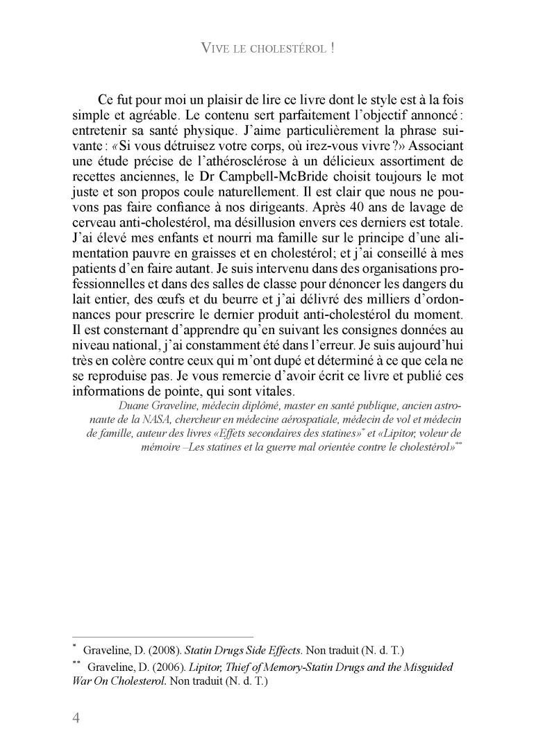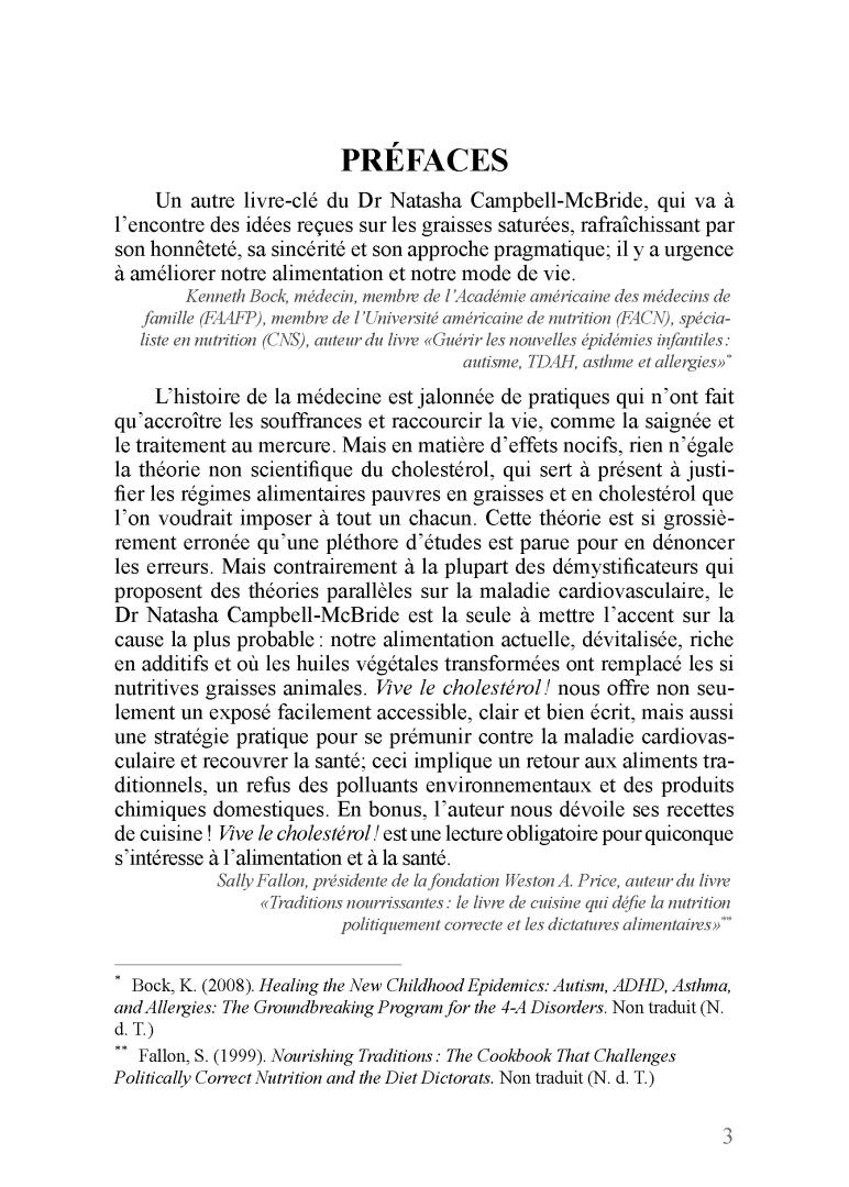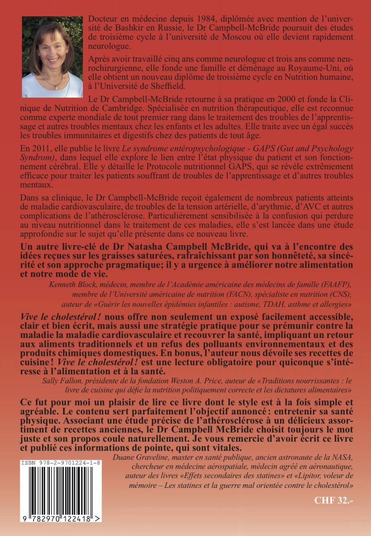 Ce fut pour moi un plaisir de lire ce livre, dont le style est à la fois simple et agréable. Le contenu sert parfaitement l’objectif annoncé : entretenir sa santé physique. Associant une étude précise de l’athérosclérose à un délicieux assortiment de recettes anciennes, Dr Campbell McBride choisit toujours le mot juste et son propos coule naturellement. Je vous remercie d’avoir écrit ce livre et publié ces informations de pointe, qui sont vitales.